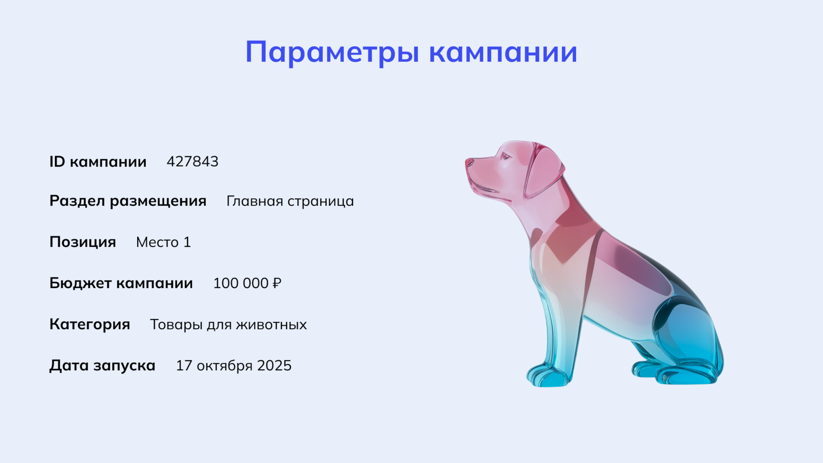 Параметры кампании: ID – 427843, раздел – главная страница, позиция – 1 место, бюджет – 100 000 ₽.