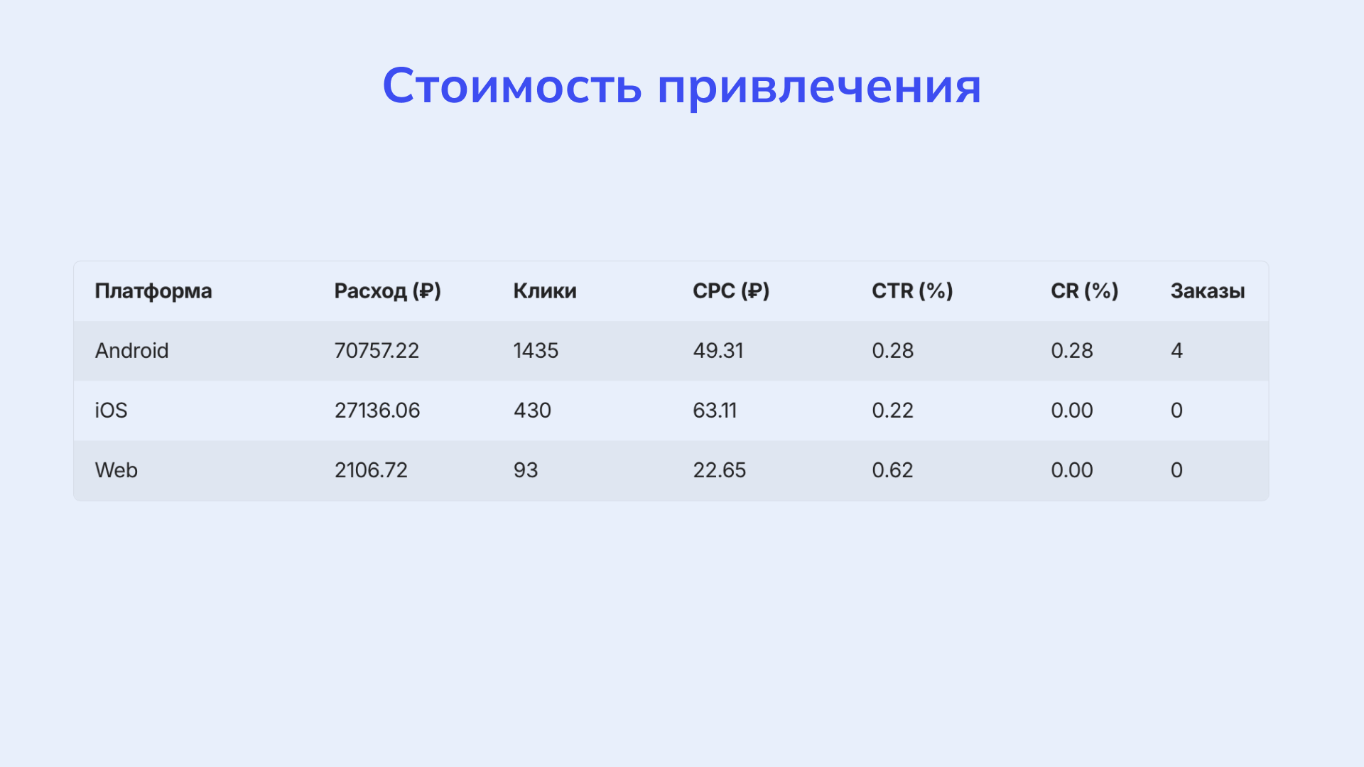 • Web-трафик показал самый низкий CPC и высокий CTR, однако не конвертировался в заказы, что может говорить о разнице в поведении пользователей на десктопе и в мобильных приложениях.