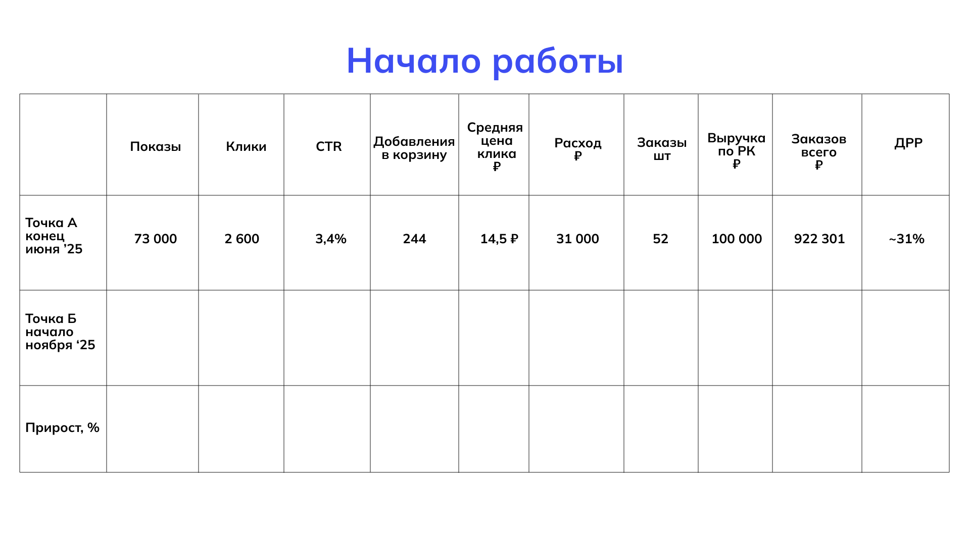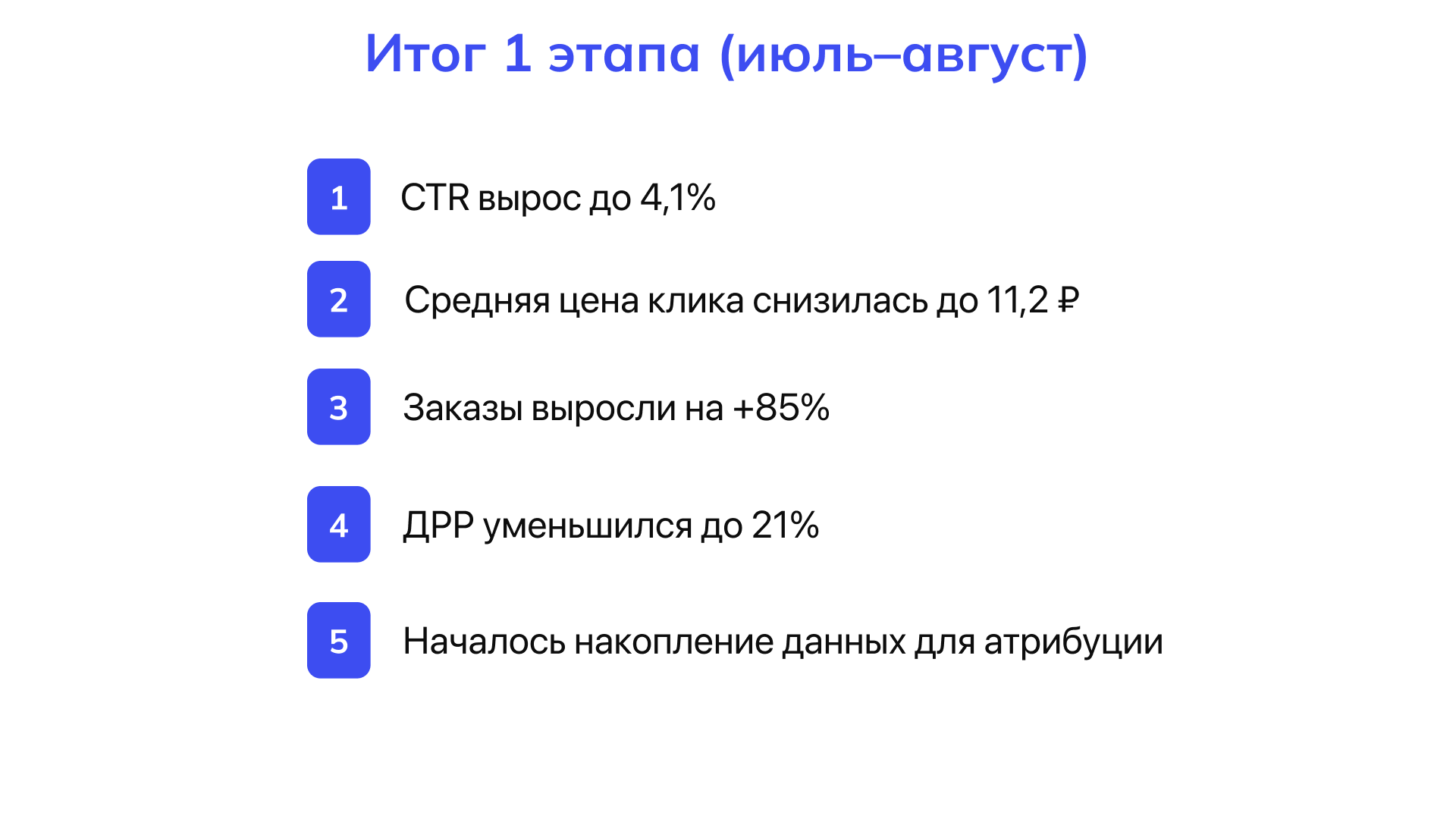 ✅ Итог этапа за июль–август: ДРР упал с 31% до 21%, заказы выросли на 85%. Начали копить данные для атрибуции.