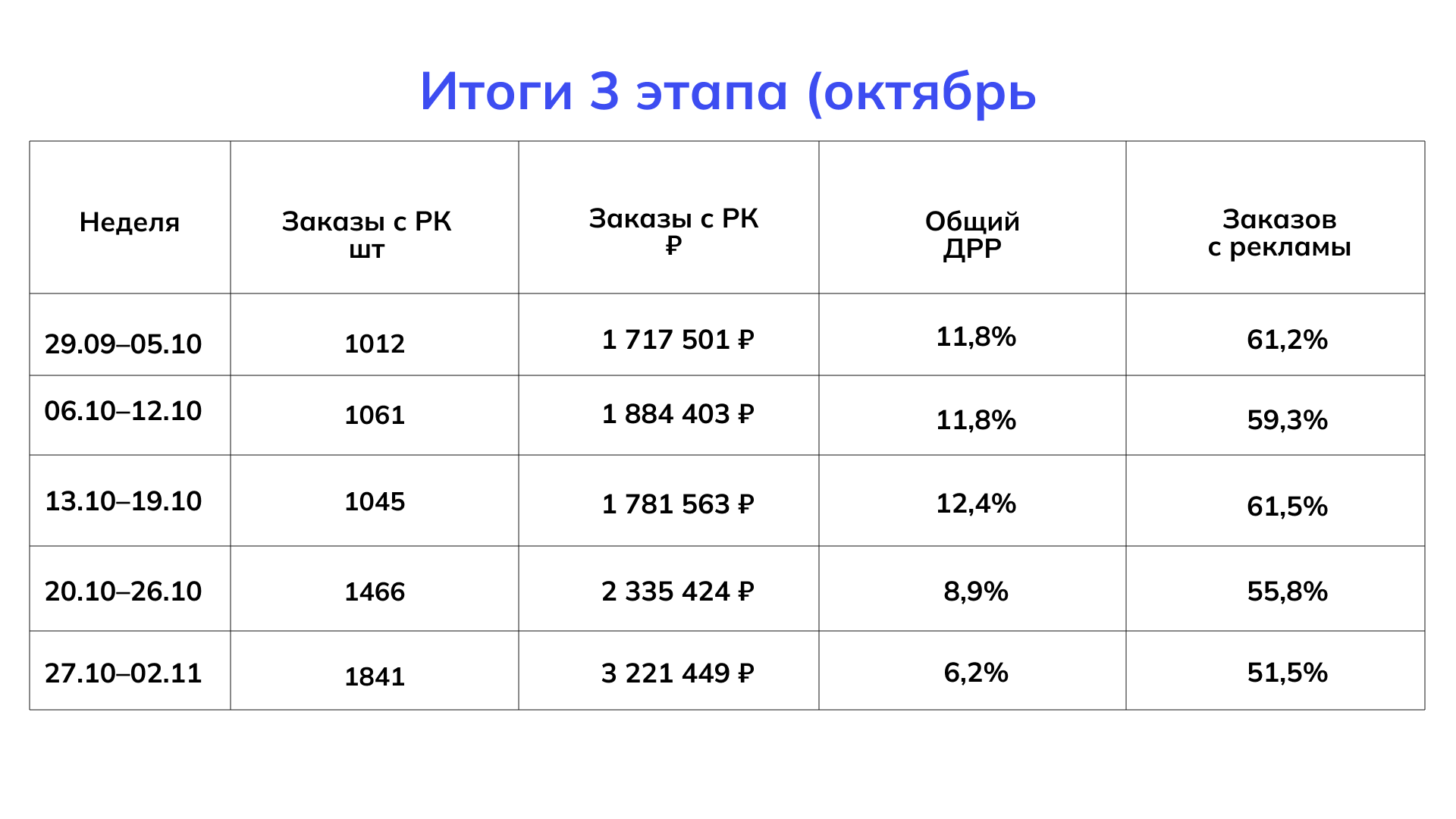 ✅ Итог этапа: Мы начали октябрь с 1012 заказов в неделю, а закончили неделей с 1841 заказом. При этом ДРР снизился до рекордных 6,2%.