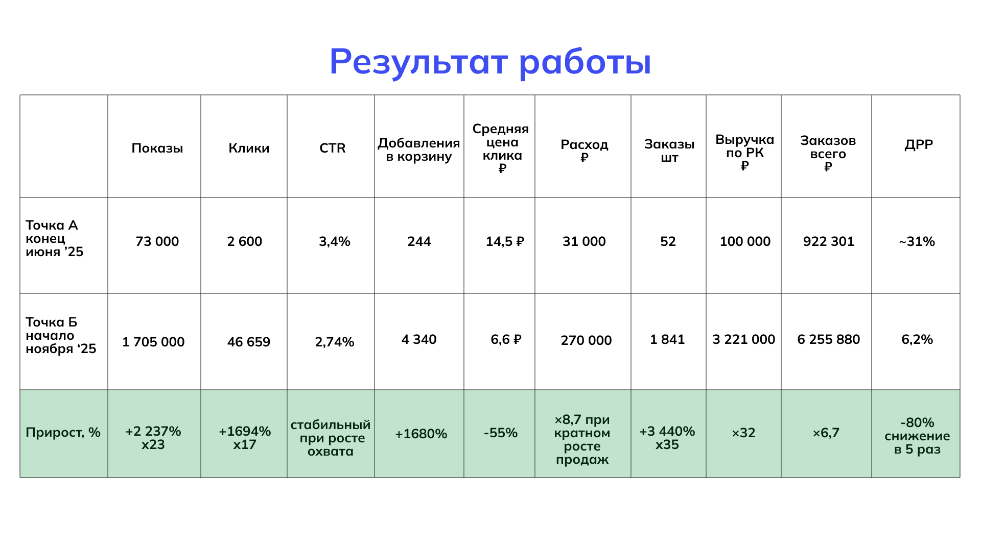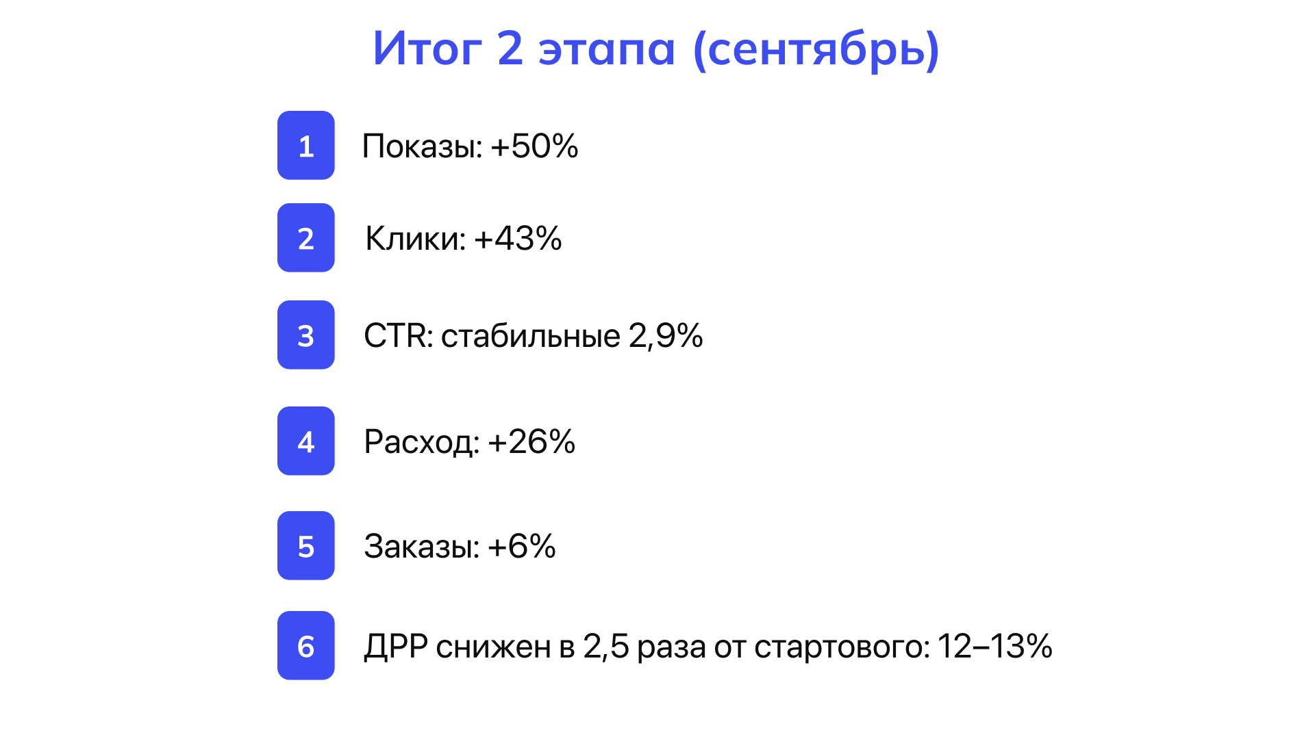 ✅ Итог этапа: ДРР снизился до 12-13%. Реклама перестала быть убыточной статьёй и начала приносить реальную прибыль.